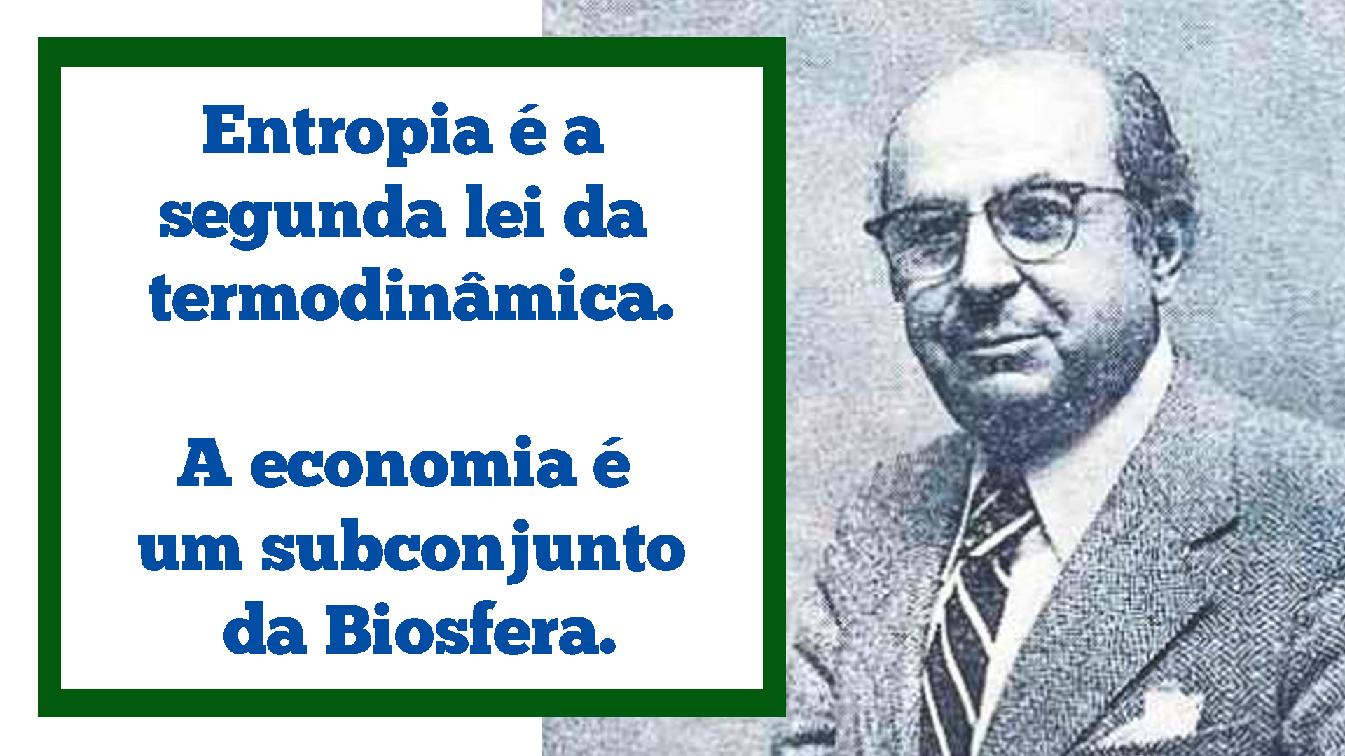 “A ideia de que o processo econômico não é uma analogia mecânica, mas sim uma transformação entrópica e unidirecional, começou a modificar meu pensamento há muito tempo [...] contudo, foi a nova representação de um processo que me possibilitou cristalizar meus pensamentos, descrevendo pela primeira vez o processo econômico como a transformação entrópica de recursos naturais valiosos (caixa entrópica) em resíduos sem valor algum (alta entropia)”.