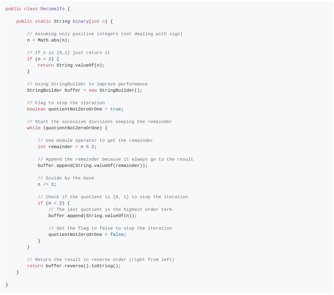 - Output: a String 's' representing the binary form of the decimal number.