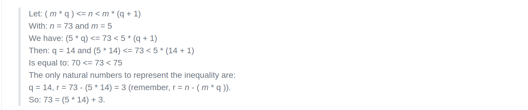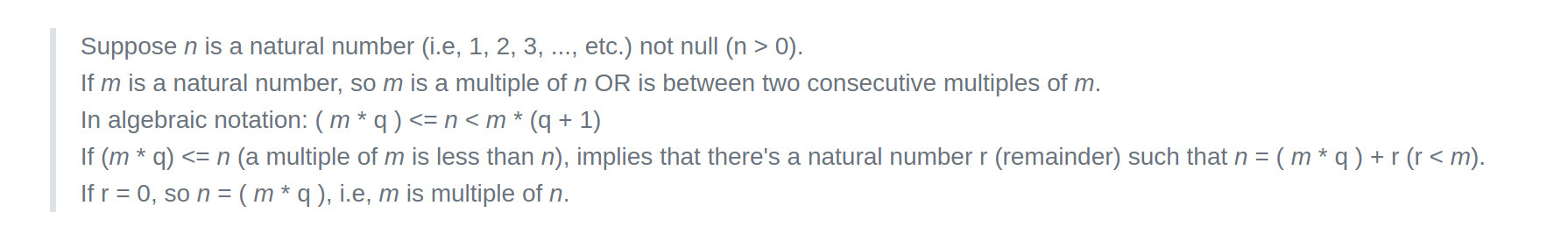 For any natural numbers n and m, with m != 0 (not null), there exists only one pair of numbers q and r such that n = ( m * q ) + r.